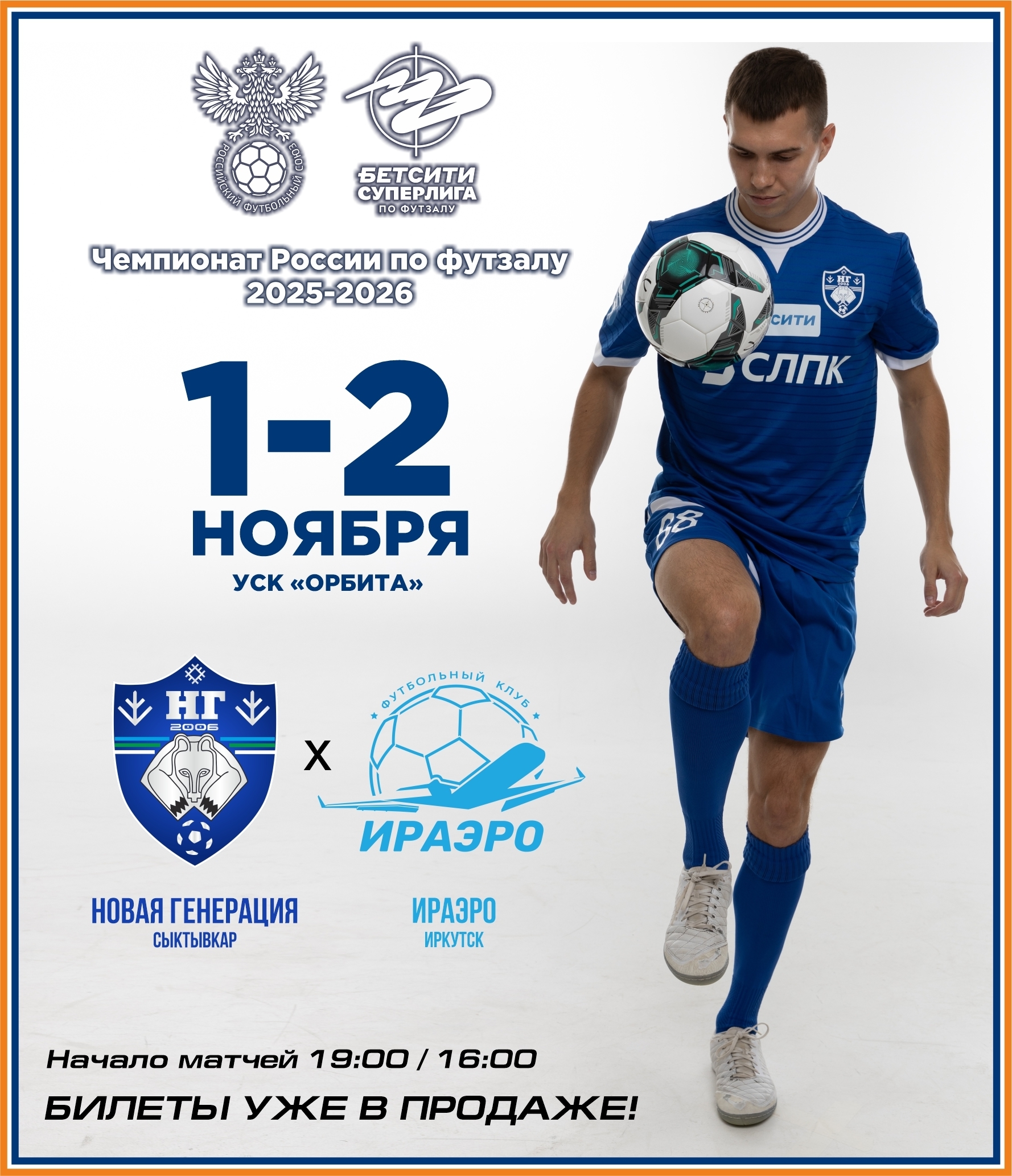 С 1 по 2 ноября пройдет Чемпионат России по футзалу 2025-2026, где будут играть команды "Новая генерация" (Сыктывкар) и "ИрАэро"(Иркутск).