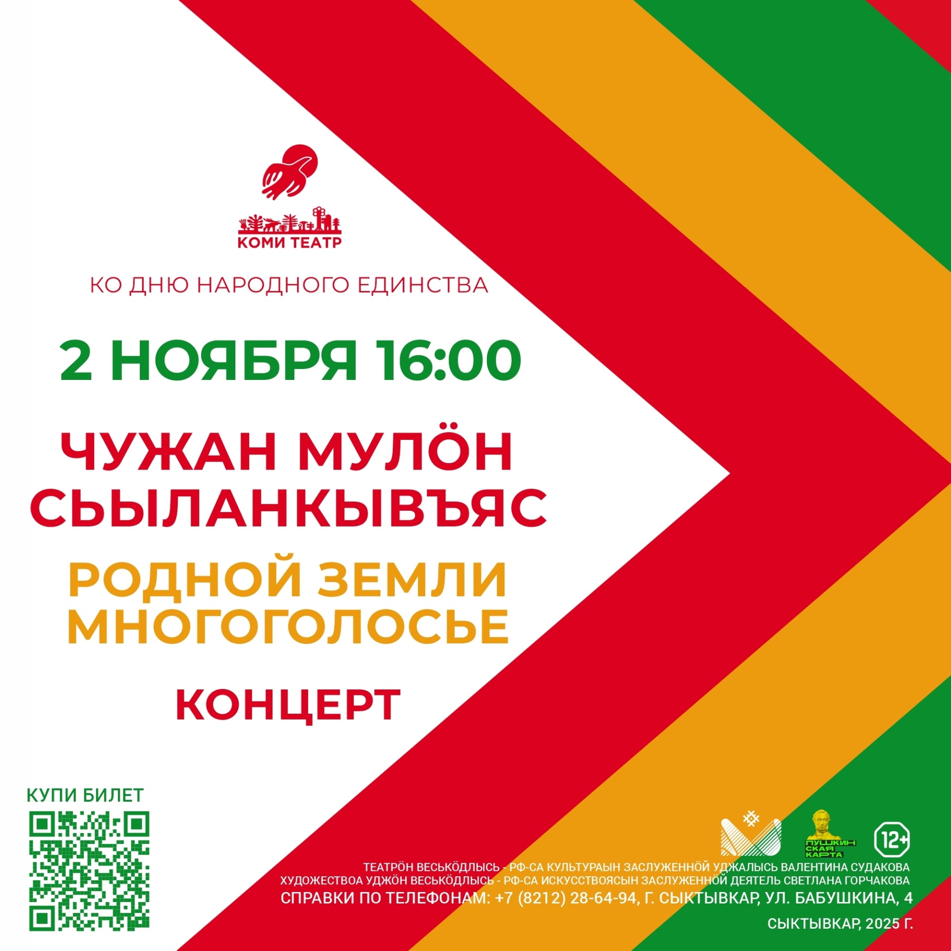 Национальный музыкально-драматический театр Республики Коми в 16:00 проведет концерт "Родной земли многоголосье" (12+).