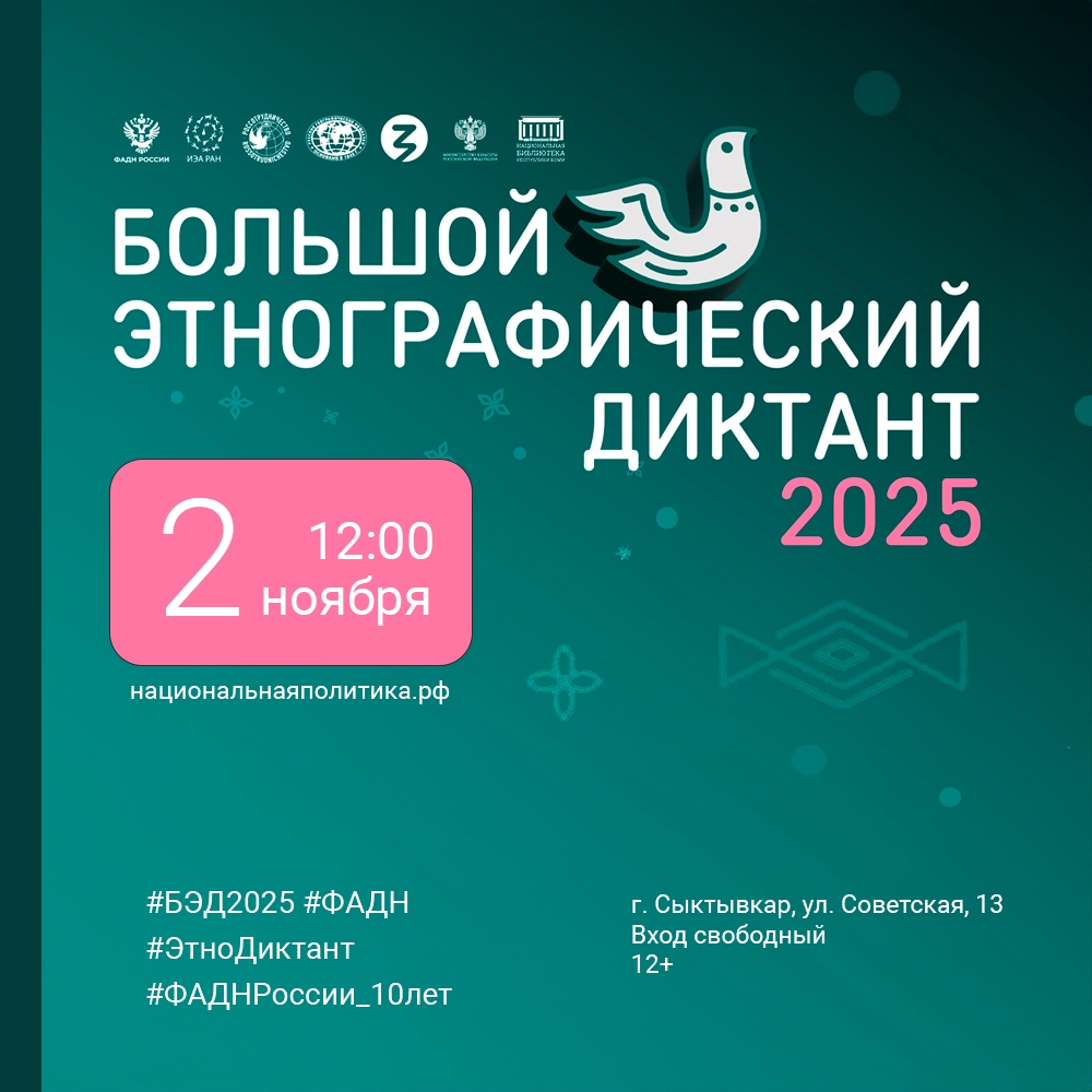 Национальная библиотека Республики Коми приглашает в 11:00 на День рождения библиотеки "Мы вместе" (6+), а в 12:00 на X Всероссийскую просветительскую акцию "Большой этнографический диктант" (12+).