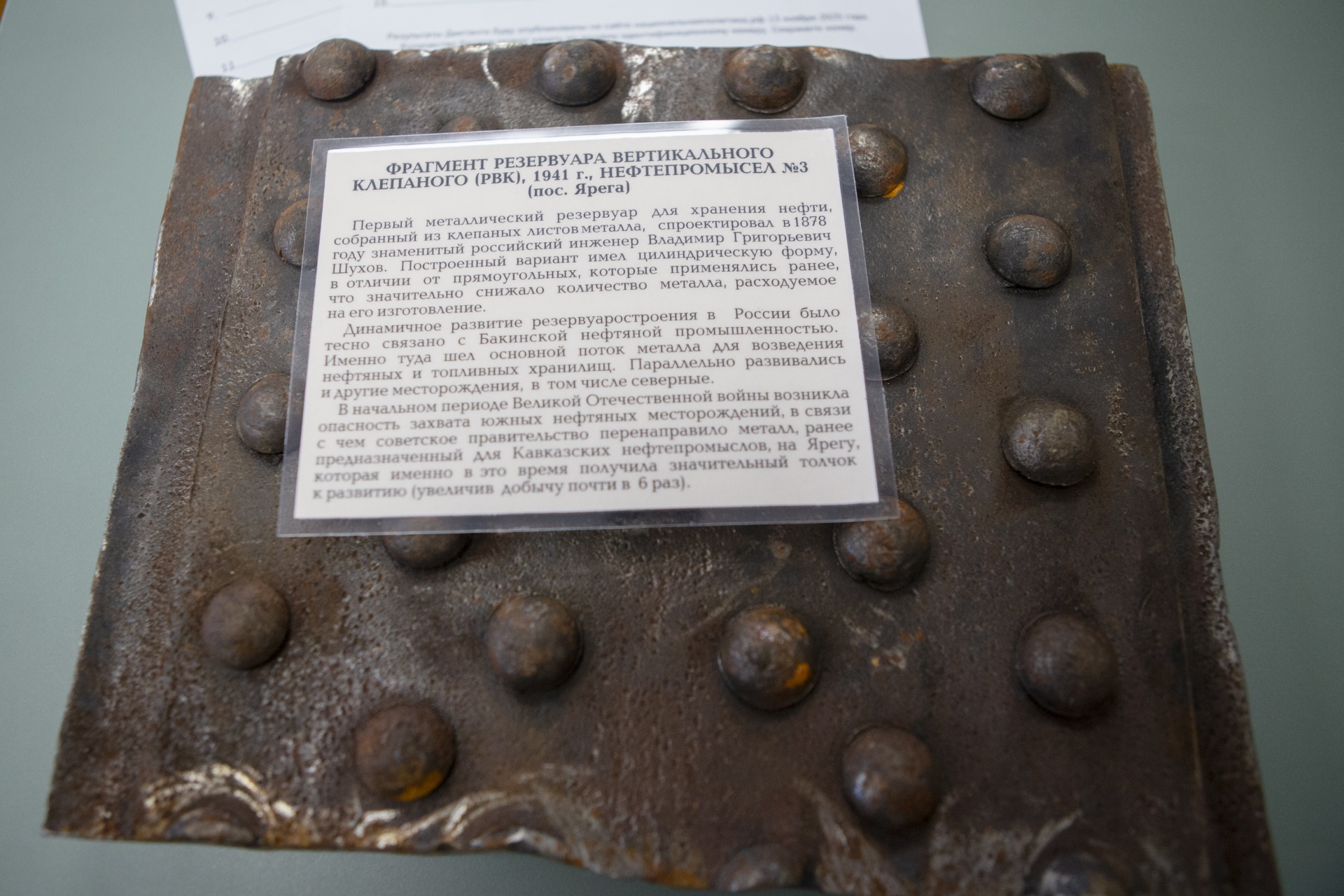 В качестве подарка на новоселье нефтяники передали УГНК еще один исторический артефакт, фрагмент клёпаного резервуара* - одного из первых, установленных на Ярегском месторождении – в 1941 году.