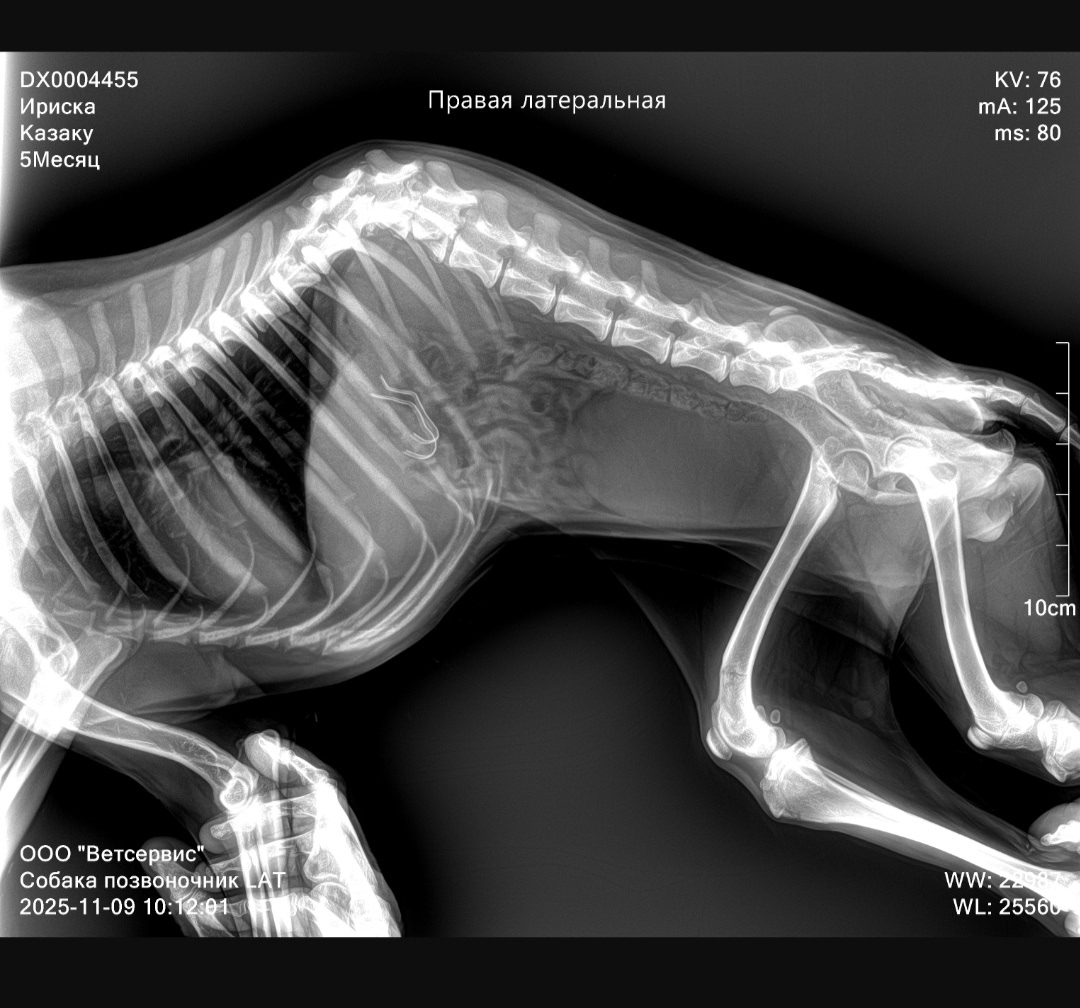 В ходе ветеринарного осмотра выяснилось, что в желудке у собаки находятся металлические скобы. Кроме того, щенок получил перелом шейки бедра и позвоночника. Как заключили специалисты, спинной мозг погиб в месте перелома, из-за чего неврологическое восстановление животного оказалось под угрозой. Мнения питерских и кировских ветеринаров по вопросу спасения разошлись: помимо восстановления возник вариант усыпить собаку.