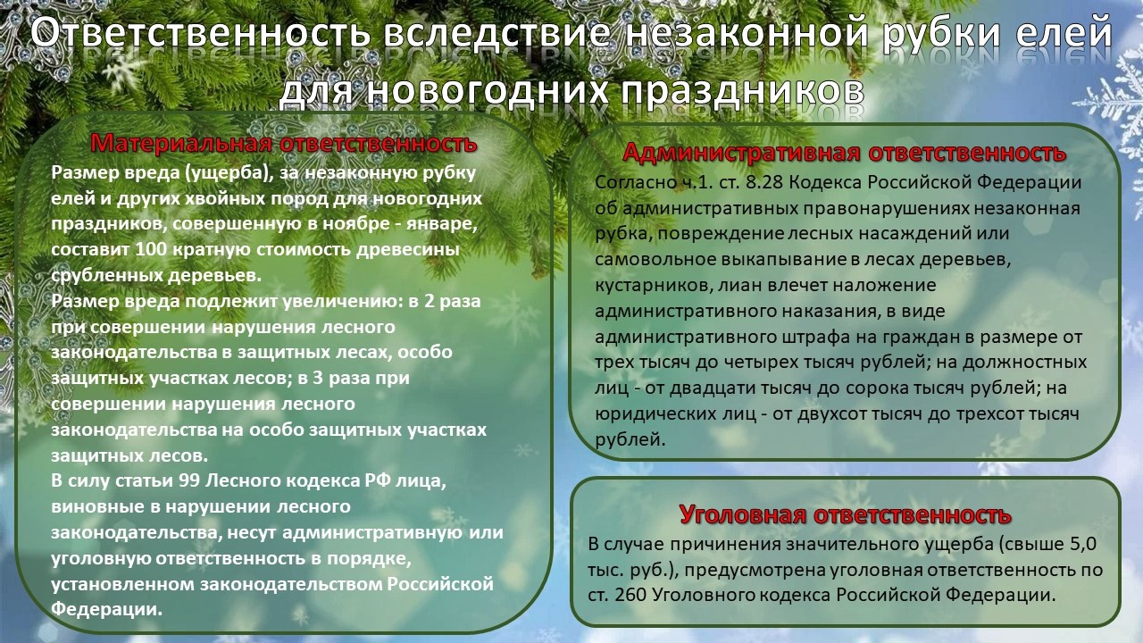В случае незаконной рубки и ущерба, который превысит пять тысяч рублей, помимо взыскания вреда, причиненного лесам вследствие нарушения лесного законодательства, нарушителю грозит уголовная ответственность по ст. 260 УК РФ.