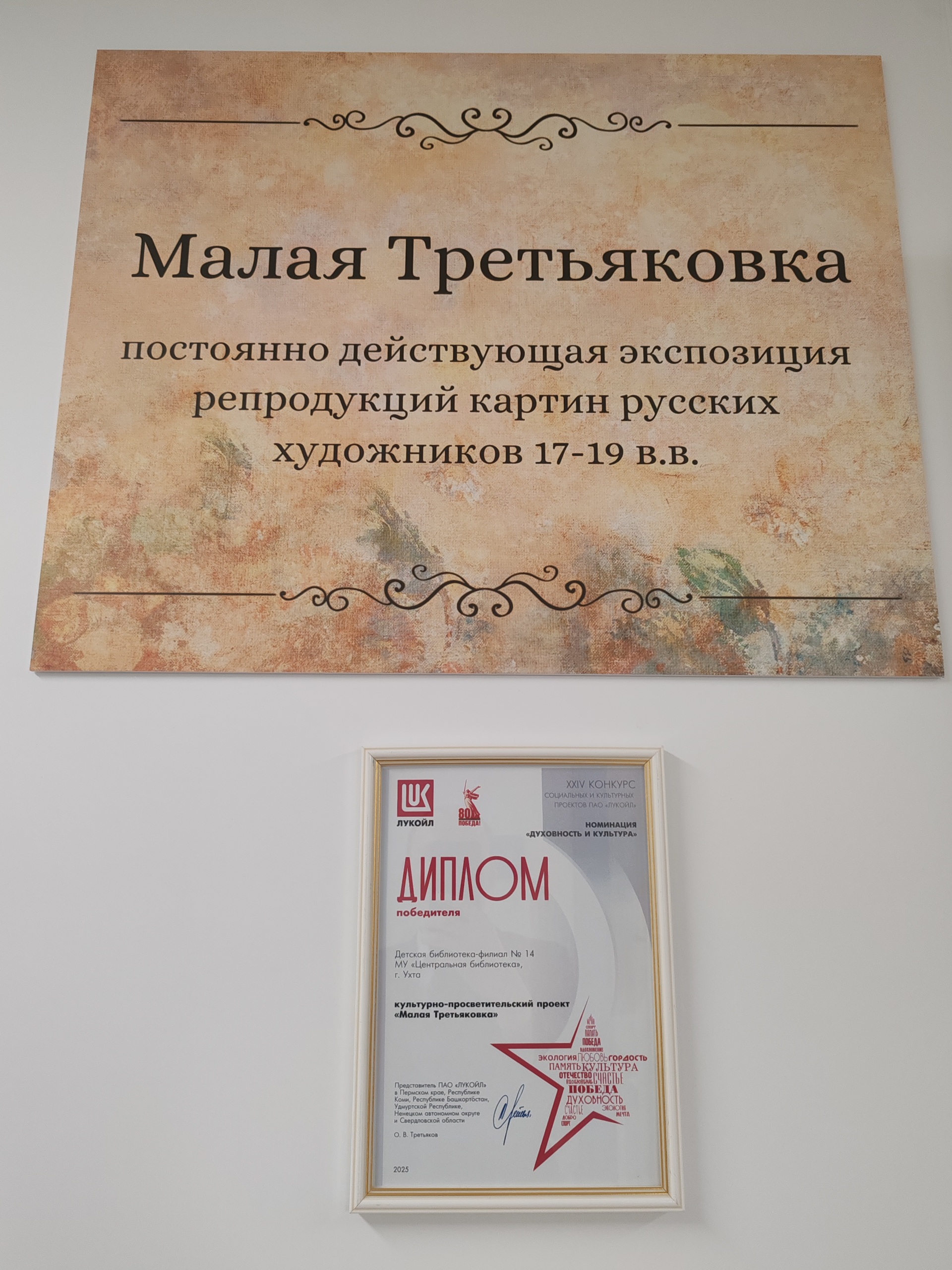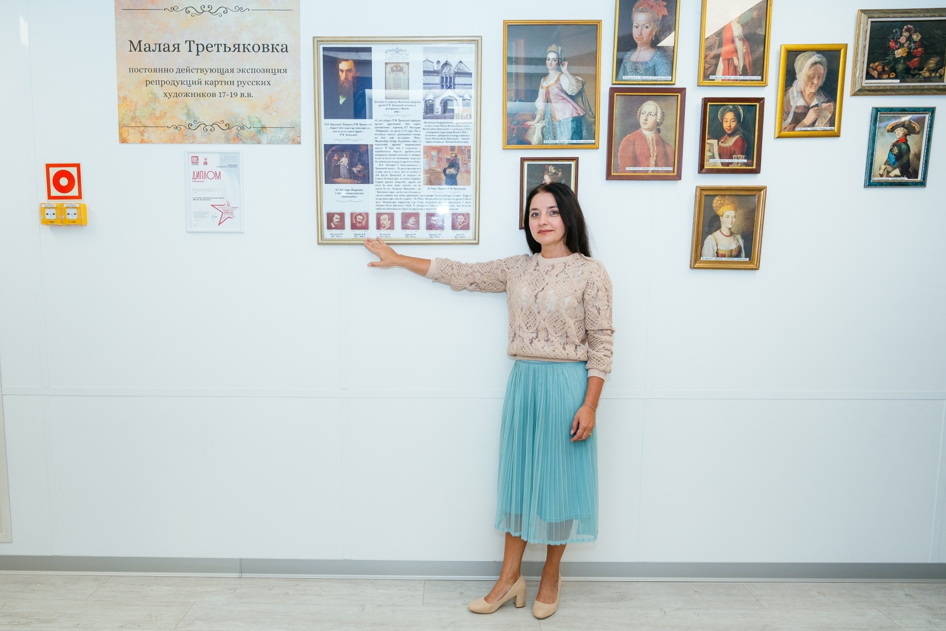 Как рассказала автор проекта восстановления экспозиции - заведующая детской библиотекой-филиалом №14 Алла Шарагина, в "Малой Третьяковке" представлены 100 репродукций шедевров изобразительного искусства, но всего их в библиотечном фонде 210, поэтому в дальнейшем запланировано сезонное обновление выставки. Победа в конкурсе социальных и культурных проектов позволила установить современные подвесные системы для экспозиции и облечь картины в новый багет.