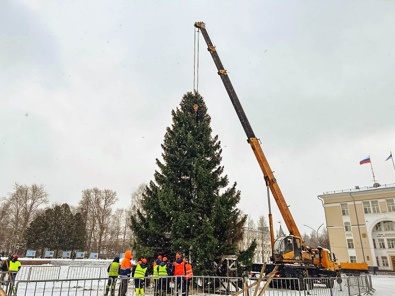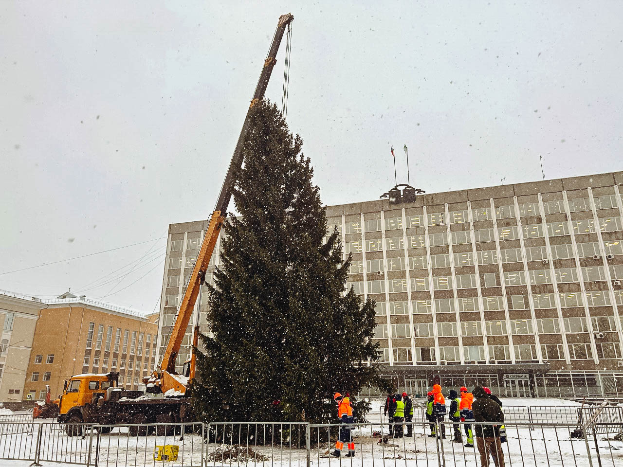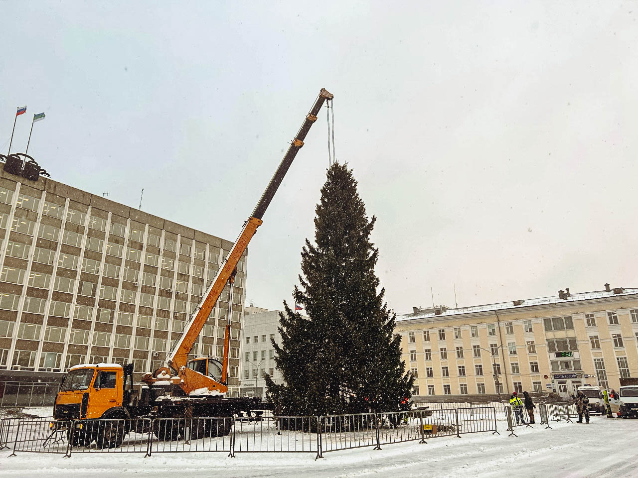 В Сыктывкаре утром 25 ноября началась установка главной новогодней елки республики, которую третий год подряд привозят из Яснэга.