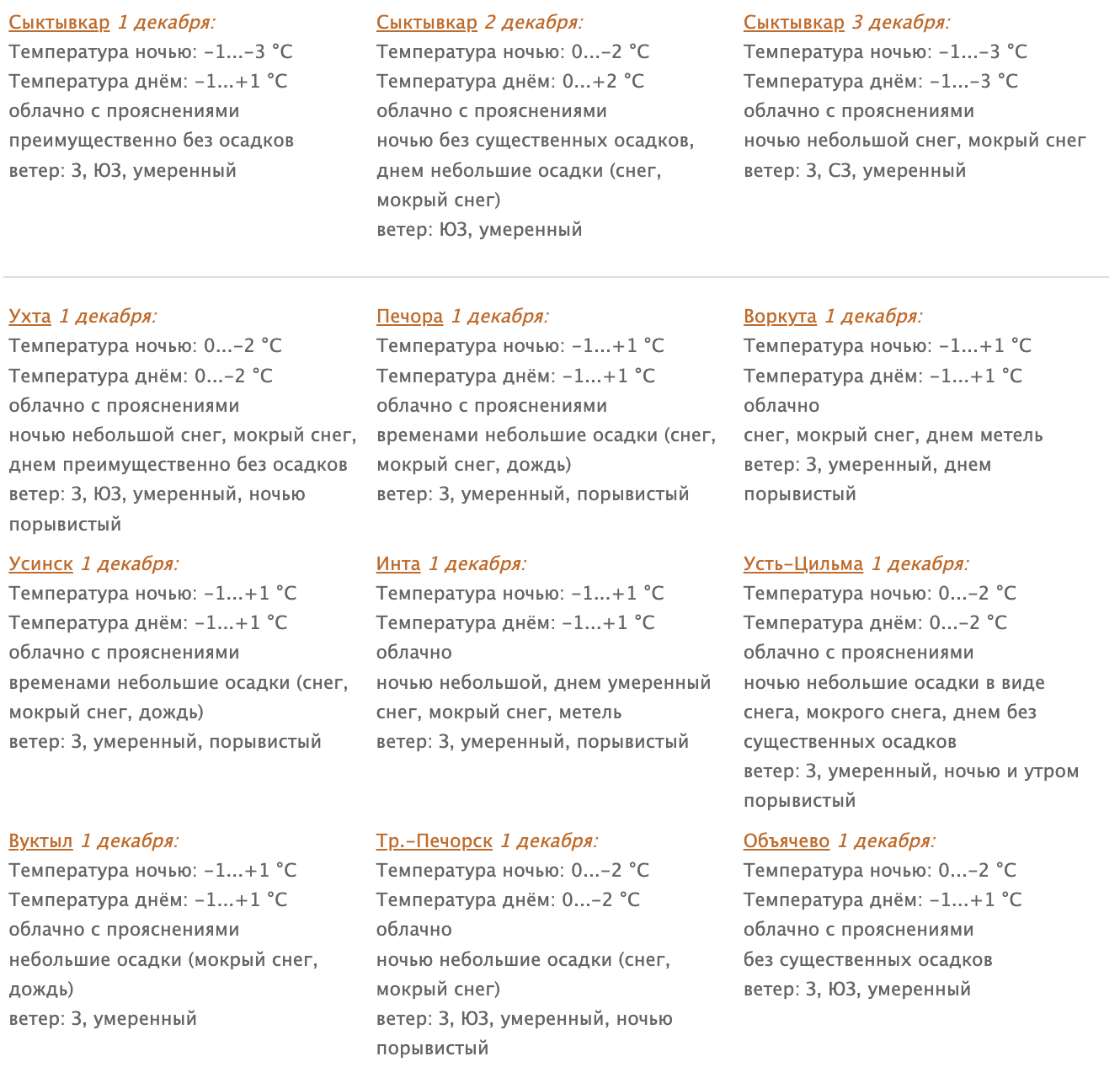 1 декабря в Коми облачно с прояснениями. В северных районах небольшие, в отдельных восточных районах умеренные осадки в виде снега, мокрого снега и дождя; днем на северо-западе без существенных осадков.