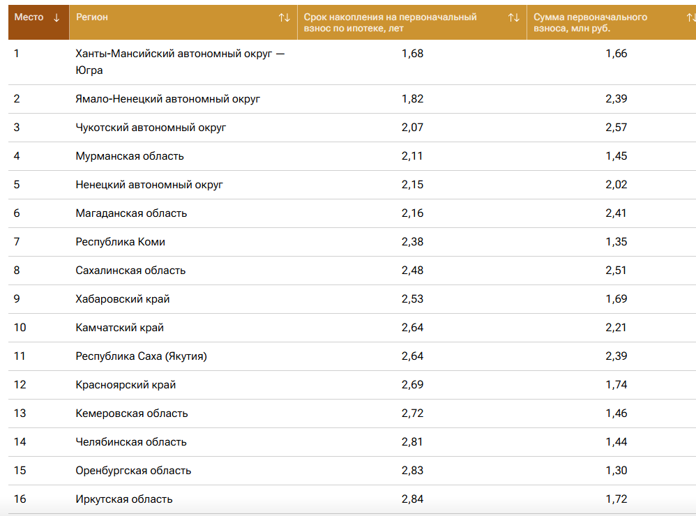 Лидером рейтинга стал Ханты-Мансийский автономный округ - Югра, где накопить на первоначальный взнос по ипотеке можно за один год и восемь месяцев. Второе место в рейтинге занимает еще один северный удаленный регион – Ямало-Ненецкий автономный округ, где срок накопления составляет один год и десять месяцев. Замыкает первую тройку регионов по скорости накопления на первоначальный взнос Чукотский автономный округ с результатом два года и один месяц.