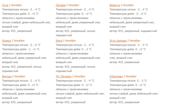 Небольшие, местами умеренные осадки в виде снега, мокрого снега, дождя. Ветер юго-западный 7-12 м/с, днем порывами до 14 м/с, ночью на северо-востоке, днем в Воркутинском районе порывами 15-20 м/с, метель. Температура ночью 0...-5°С, днем +2...-3°С.