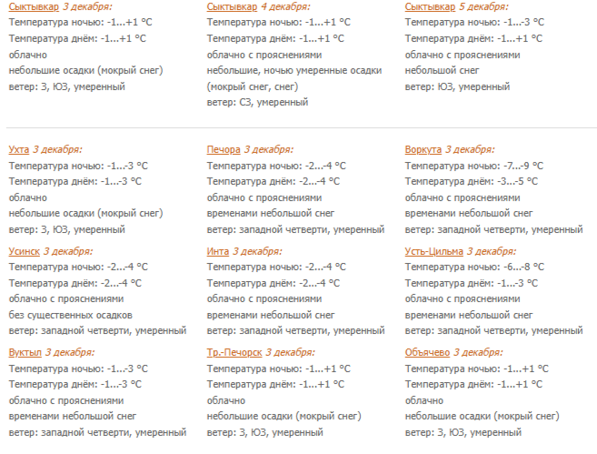 3 декабря в Коми облачно с прояснениями, небольшие, днем в отдельных западных районах умеренные осадки (снег, мокрый снег). Ветер западной четверти 6-11 м/с. Температура ночью и днем -4...+1°С, на севере ночью при прояснении до -10°С.