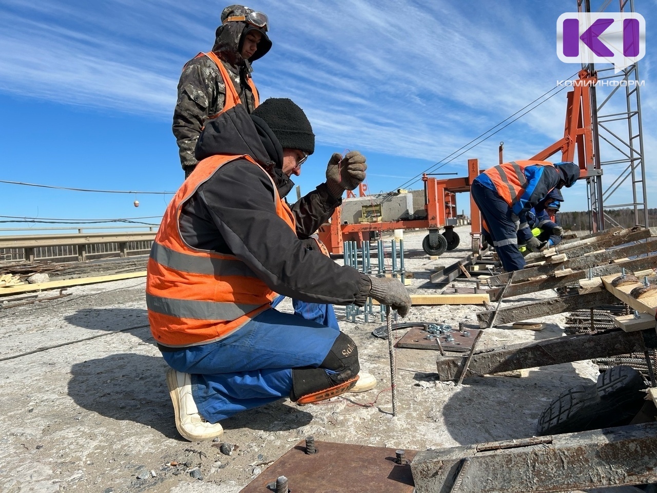 Контракт с новой подрядной организацией - ООО "СеверРегионСтрой" из Сыктывкара - заключили в первой половине 2025 года. Сейчас начались работы на правой половине проезжей части моста - на 47-м километре дороги "Сыктывкар-Троицко-Печорск". В частности, работники подрядной организации выполняют комплекс строительно-монтажных работ, например, армирование и монтаж бордюров.