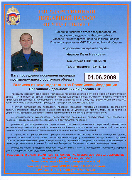 Он напомнил, что по требованию Главы МЧС России Сергея Шойгу на каждом объекте должен висеть "информационный лист" с фотографией инспектора пожарного надзора, который этот объект проверяет, сведения о нем, данные о том, когда инспектор последний раз проверял объект, а также необходимая контактная информация.