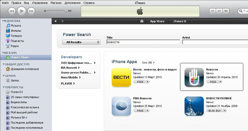 Затем надо запустить программу, нажать в левом окошке на "Магазин" (iTunes store). Далее в строке "Поиск" ввести слово "Новости" и по результатам нажать кнопку Free. Если у вас нет учетной записи, вам предложат зарегистрироваться (указать электронный адрес и пароль). Затем на этот адрес придет ссылка, нажав на которую вы активизируете свой аккаунт (учетную запись). Программа загрузится в "Загрузки".