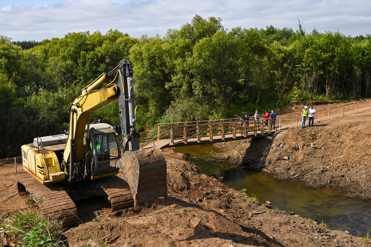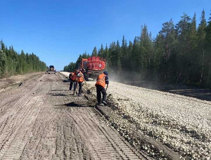На участке 14,9 км выполнены работы по укладке верхнего слоя из щебёночно-мастичного асфальтобетона, укреплению обочин щебнем, устройству съездов автодороги.