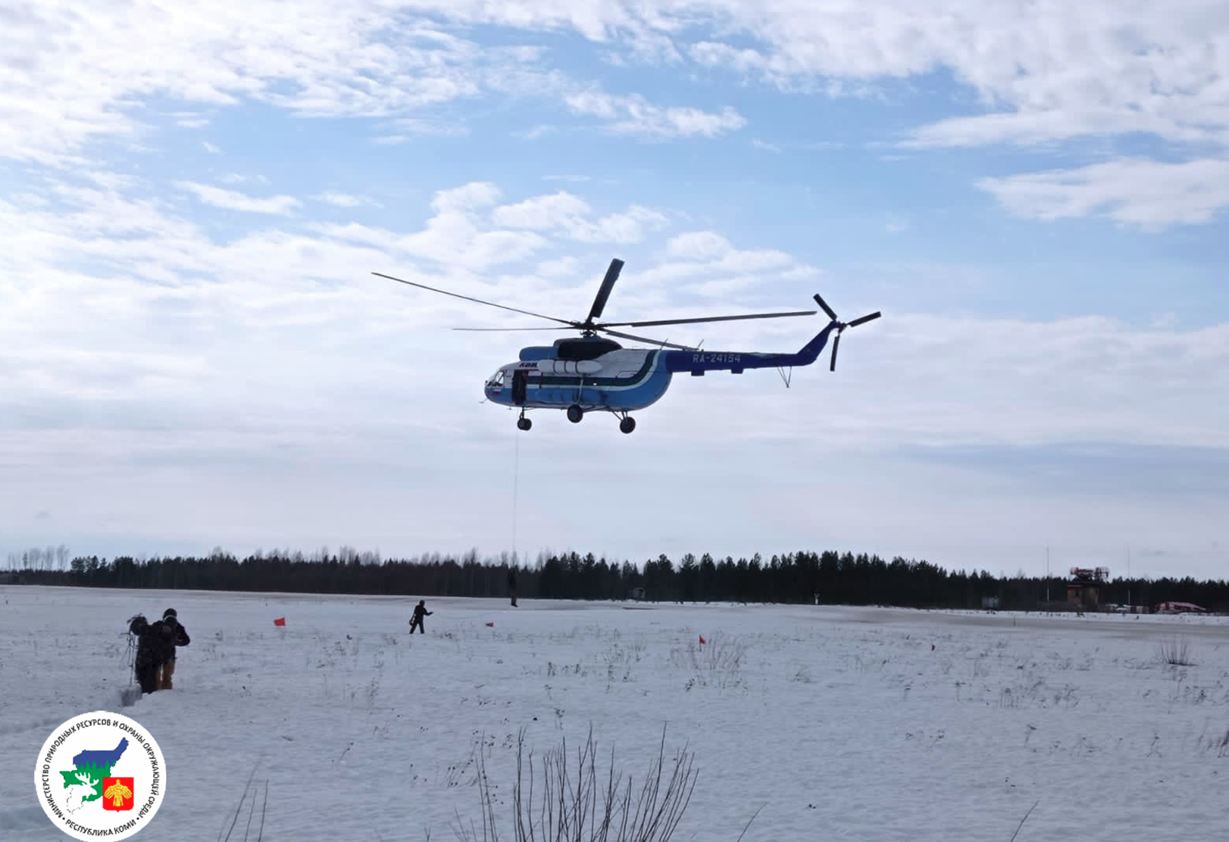 Десантники-пожарные Коми лесопожарного центра отрабатывают тренировочные спуски на спусковых устройствах с вертолета Ми-8.