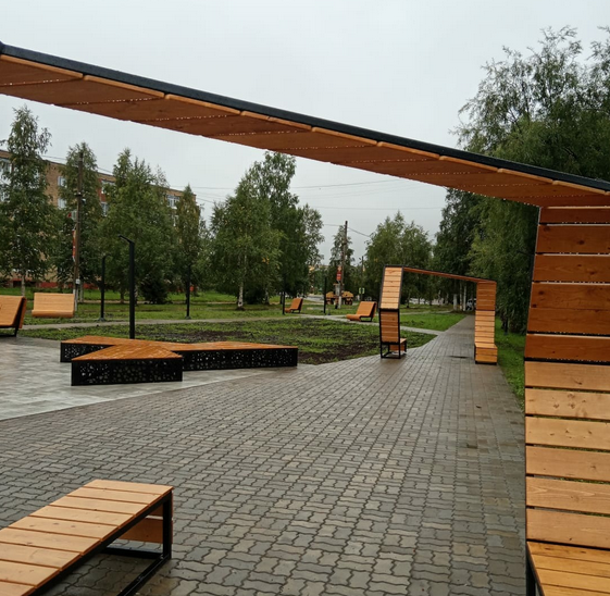 В сквере уложили современную тротуарную плитку, установили освещение. Также на объекте появились арт-объекты: фигура "Медведица с медвежонком", современные беседки и скамейки.