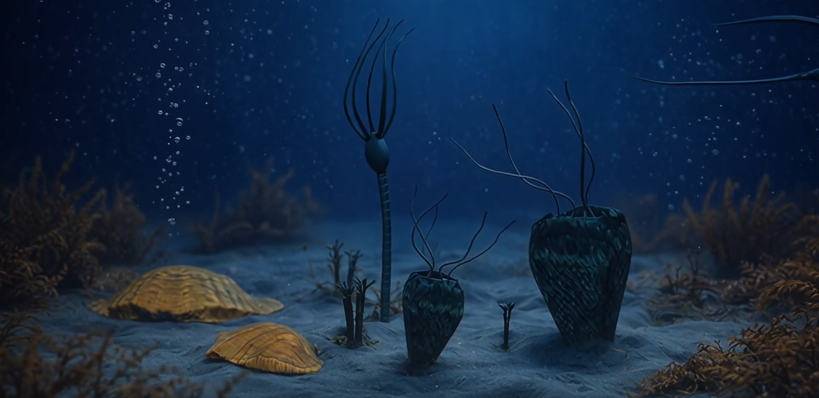 Работа сопровождает научный доклад специалиста и призвана наглядно продемонстрировать структуру пищевой цепи в период, предшествовавший появлению динозавров на 100 млн лет.