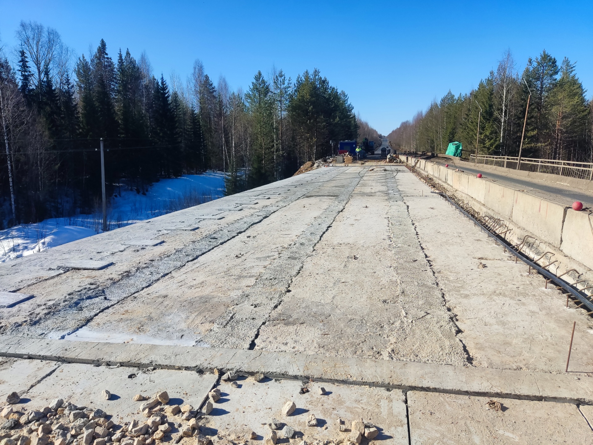 В настоящее время выполняются работы по подготовке к устройству выравнивающего слоя из бетона, после чего планируется выполнить гидроизоляцию и защитный слой мостового полотна.