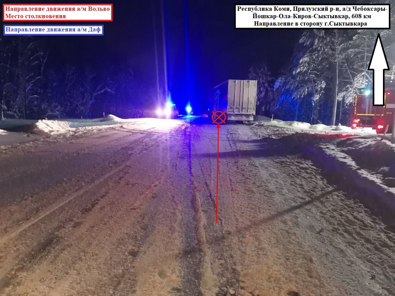 В 22:00 водитель 1964 г.р., управляя Volvo с прицепом, не учел безопасную дистанцию до впереди движущегося DAF. На 608 км трассы Вятка произошло столкновение.