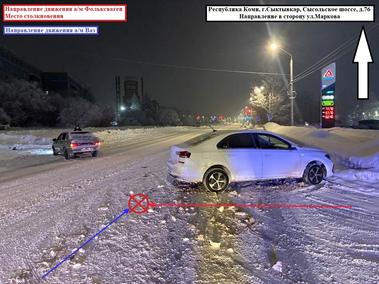 В 01:20 водитель 1990 г.р., управляя Volkswagen Polo, при выезде с прилегающей территории д. 76 по Сысольскому шоссе не уступил дорогу и столкнулся с ВАЗом.