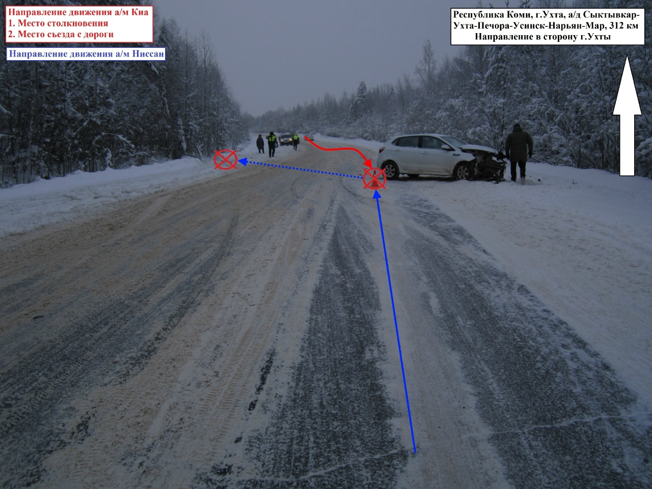 5 января в 11:27 мужчина 1970 г.р., управляя Kia, двигался по дороге Сыктывкар – Нарьян-Мар, на 312 км не справился с управлением, выехал на встречную полосу, где столкнулся с Nissan Teana.