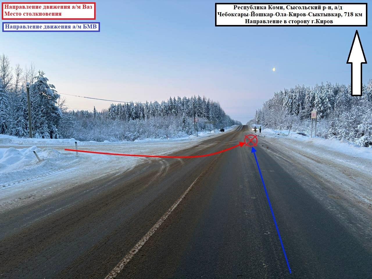 Как сообщили "Комиинформу" в Госавтоинспекции Коми, водитель 1972 года рождения за рулем ВАЗ-1111 ("Ока") ехал по автодороге "Куниб-Вотча" со стороны Куниба в направлении автодороги "Чебоксары-Йошкар-Ола-Киров-Сыктывкар". На 718-м километре автодороги при выезде со второстепенной дороги водитель, осуществляя маневр поворота налево, не предоставил преимущества в движении. В результате произошло столкновение с автомашиной BMW, которая двигалась по главной дороге слева направо по ходу движения автомобиля ВАЗ. После столкновения иномарка съехала с дороги в правый по ходу движения кювет.