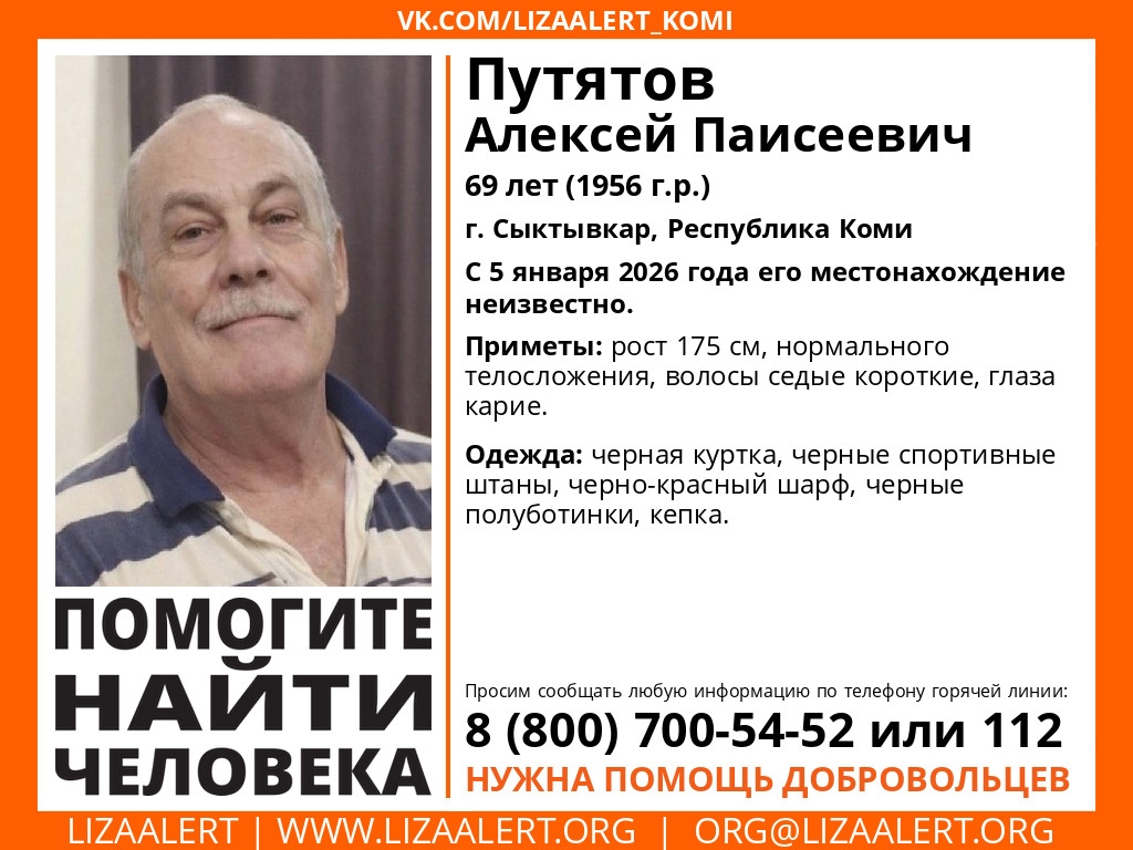 В Сыктывкаре ищут 69-летнего Алексей Путятова. С 5 января его местонахождение неизвестно, сообщают добровольцы отряда "ЛизаАлерт".