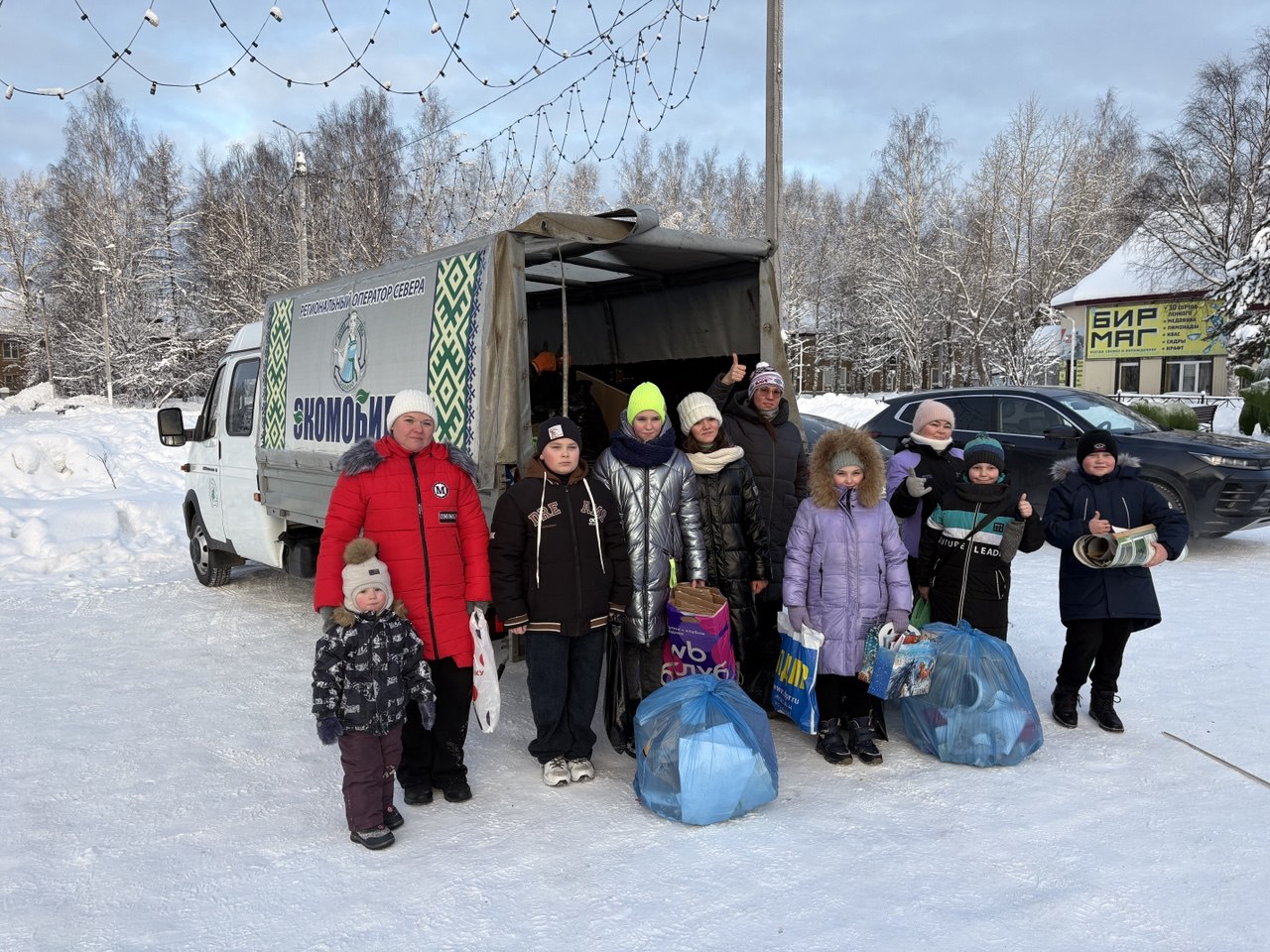Экомобиль "Лысва" активно работал по всей республике. Первая экологическая акция в новом 2026 году прошла в двух населенных пунктах Усть-Вымского района: Айкино и Жешарте. На акции сотрудников Регионального оператора Севера ждал приятный сюрприз: их поздравила с Новым годом Снегурочка - активистка Движения Первых Роза Семенова. Она вручила сладкие подарки и новогодние открытки, подготовленные волонтёрами Победы с. Айкино, а также участниками сообществ "Родные-Любимые"" и "Движение Первых" Усть-Вымского района.
