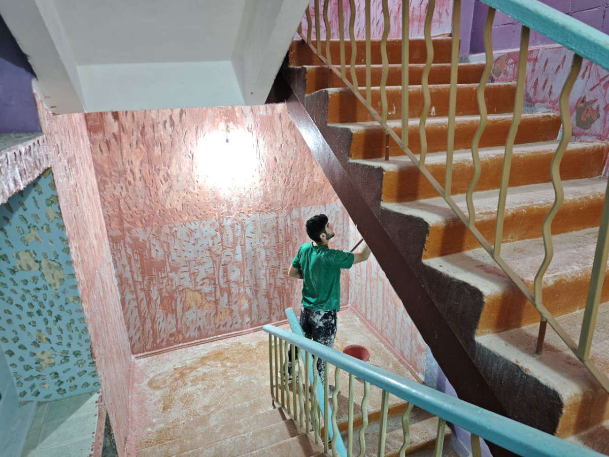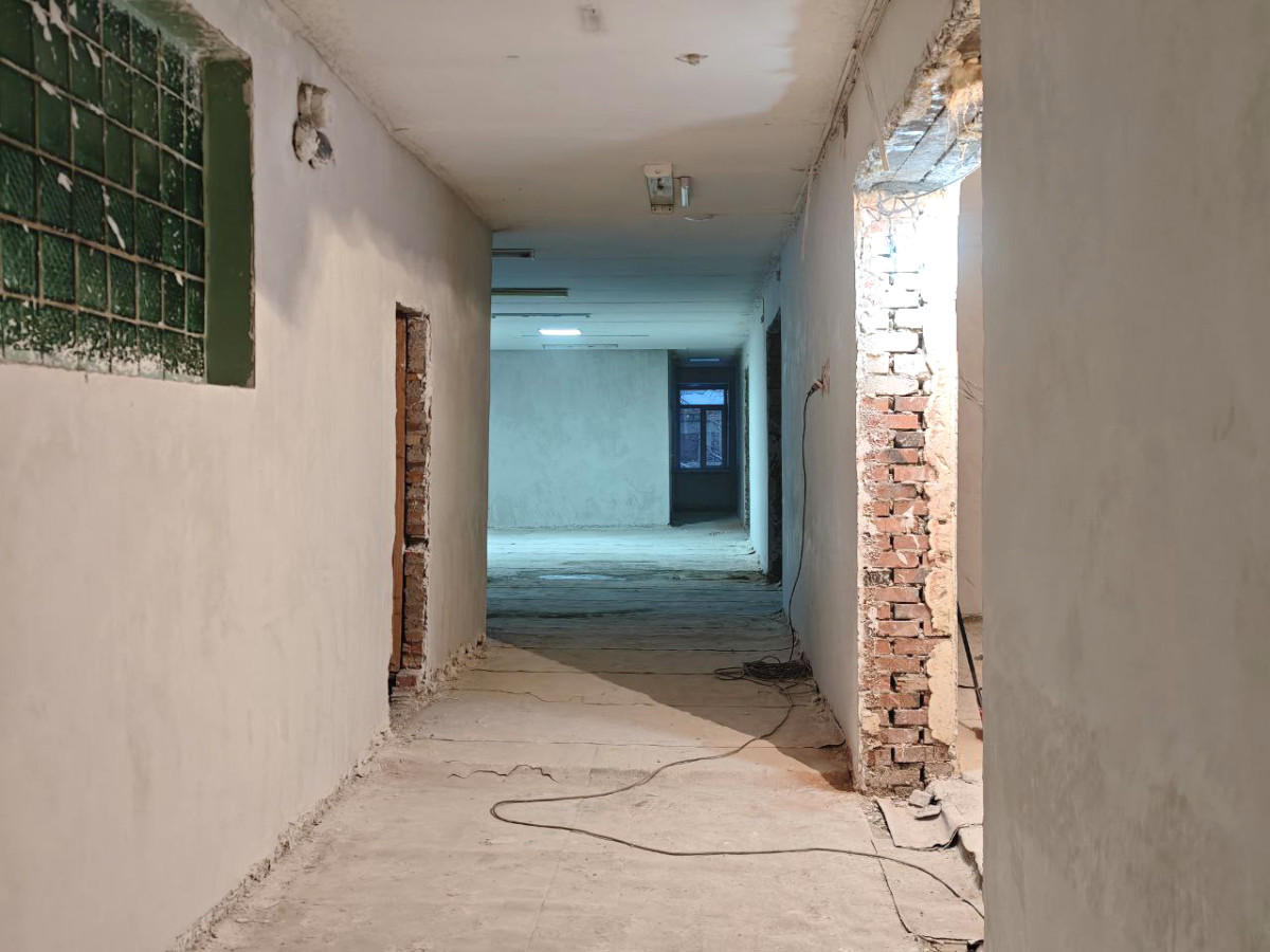 На сегодня подрядной организацией полностью выполнены демонтажные работы на всех четырёх этажах. Завершена зачистка швов потолков, на все стены и лестничные проёмы нанесены насечки. Установлено 174 новых окна. Ведутся электромонтажные работы.