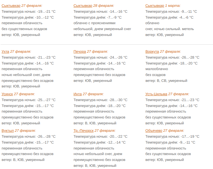 В Сыктывкаре 27 февраля переменная облачность. Без существенных осадков. Ветер юго-восточный 3-8 м/с. Температура ночью -19...-21°С, днем -10...-12°С.
