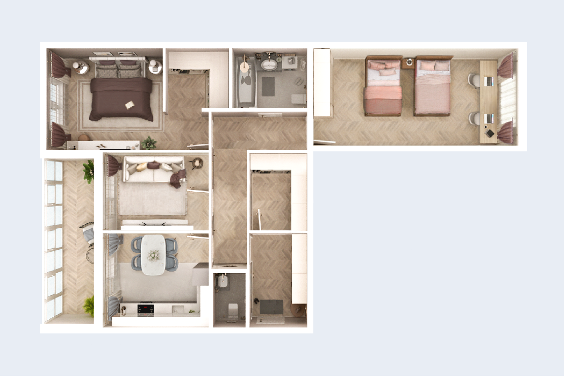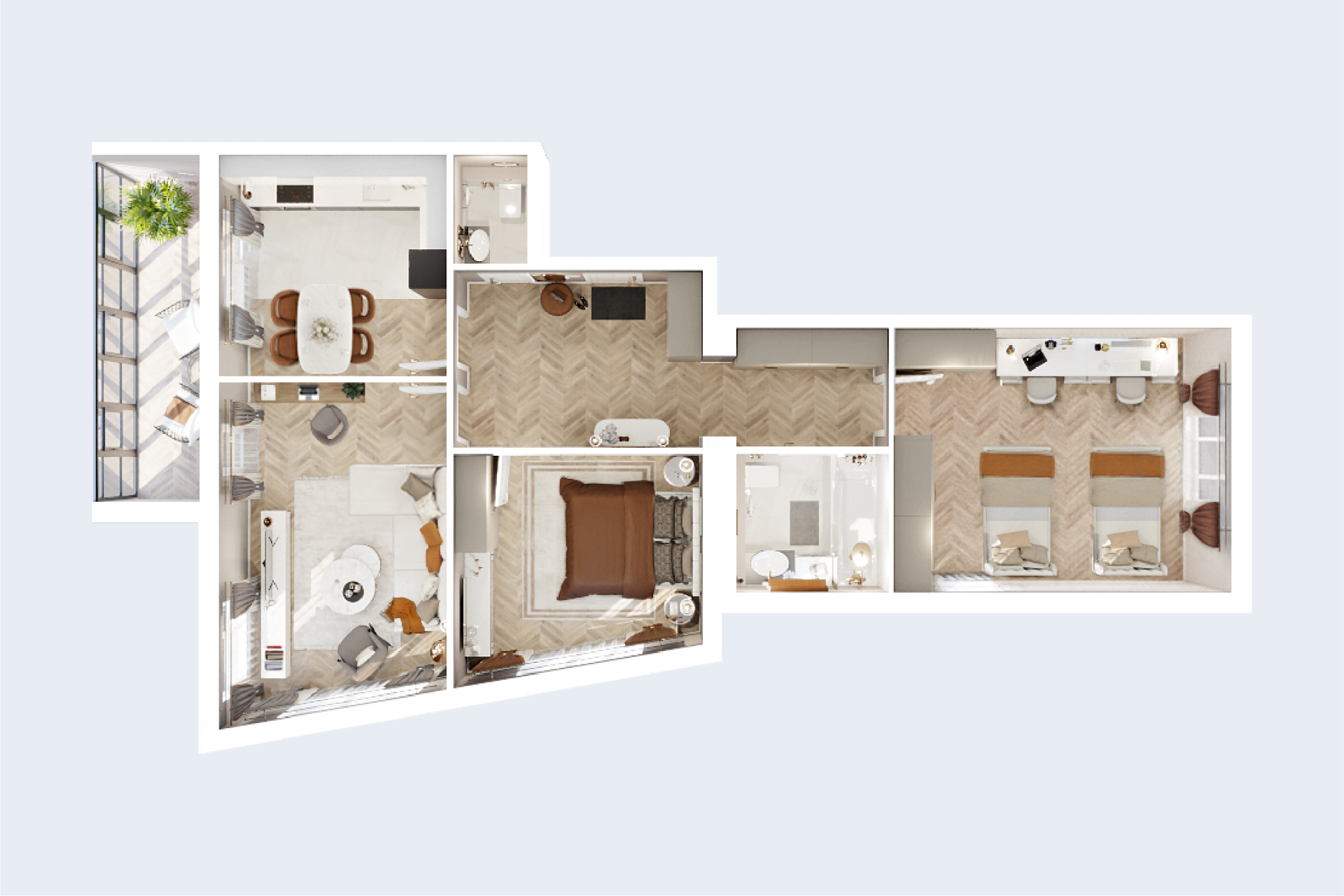 - 3-комнатная квартира на две стороны 91,2 м² с двумя большими спальнями, отдельными гостиной и кухней, двумя гардеробными и двумя санузлами, просторной лоджией на две комнаты. На этаже всего четыре квартиры.