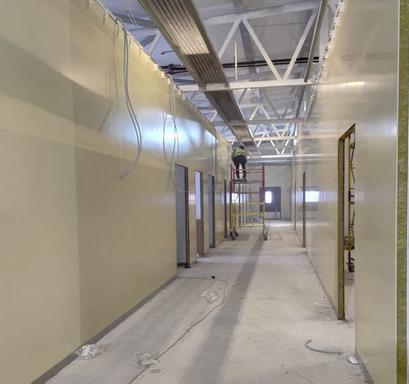 Строители монтируют внутренние перегородки, устанавливают двери, прокладывают внутреннюю электропроводку и налаживают систему пожарно-охранной сигнализации.